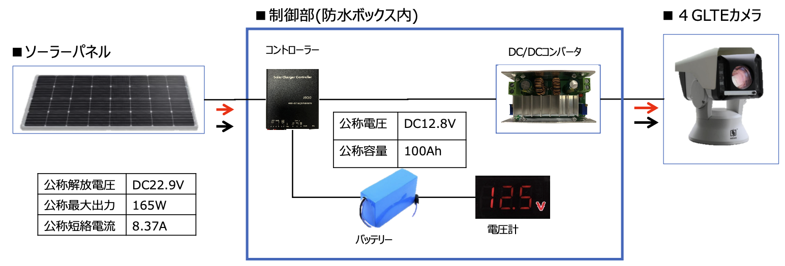 システムの構成は以下のように、①ソーラーパネル、②防水ボックス、③4G LTEカメラで構成しました。
